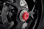Offering protection to the lower single-sided swing arm and sprocket carrier, EP Rear Spindle Bobbins for the Ducati Streetfighter V4 are easy to fit.   The advanced design has an aluminium core with the nylon bobbin head above.   The materials are independent, allowing the nylon to shift on impact aiming to reduce stress on the wheel.   An attractive red hub stop secures the spindle rod on the exhaust side.