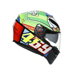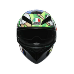 The AGV K3 SV Helmet builds on AGV's extensive experience in designing the Pista GP and Corsa helmets as well as the legacy of the original K3 helmet. An aerodynamic shell shape is optimized for stability and aggressive aesthetics and features an integrated, compact rear spoiler to reduce turbulence. The narrow chin bar is streamlined to help the helmet cut through the wind at high speeds, further increasing stability.