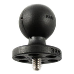 The RAM-B-202A and RAP-B-366 universal camera and camcorder bases consist of a 1" diameter rubber ball connected to a 1/4"-20 camera thread. The round plate on the RAM-B-202A and RAP-B-366 provides extra support and stability for cameras that rest on top of it. The male 1/4"-20 threaded steel stud will connect to any standard female thread found on camcorders and digital cameras.