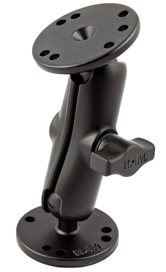 The RAM-B-101U consists of a Medium Length B size 1" double socket arm and two 2.5" diameter round plates that contain the universal AMPS hole pattern. The mount is designed with a patented rubber ball and socket system that dampens shock and vibration, and allows for almost infinite adjustment to achieve the perfect viewing angle. The AMPs hole pattern found on the round plate will connect to many RAM products.