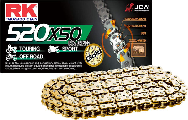 The 520 XSO Chain features RK's proprietary "RX-Ring" seal design. Viewed in cross-section, the RK "RX-Ring" has two lubrication pools and seal points versus the single seal point/pool design of a regular o-ring chain. RK chains offer quality, performance and unbeatable value for all but the most demanding high-performance applications.